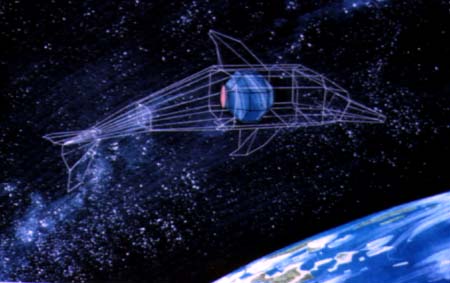 Fig. 1. Space Flight Dolphin, rendering of deployed satellite/ sculpture in low earth orbit, 1991. The dolphin will be constructed from Nitinol, a "shape memory" alloy that is activated by sunlight in space. The aluminum polyhedron housing will contain electronics, batteries and solar cells. (Illustration: Edgar Duncan)